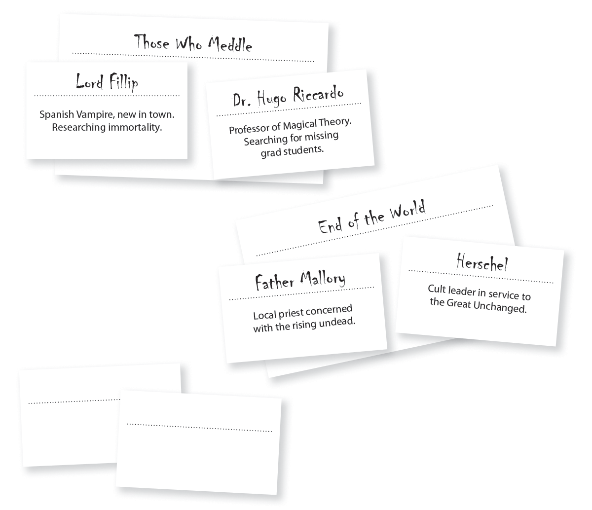 At the start of play, explain the current issue to your players and ask them to fill in one or two additional faces associated with the issue. These extra characters will provide new plot hooks and twists to tie your players more deeply to the strange phenomena they face as necromancers. Then ask your players to choose from one of the two available impending issues: Those Who Meddle and End of the World. Have them fill in one or two additional faces for their chosen impending issue, as well, rounding out the larger cast of characters.
