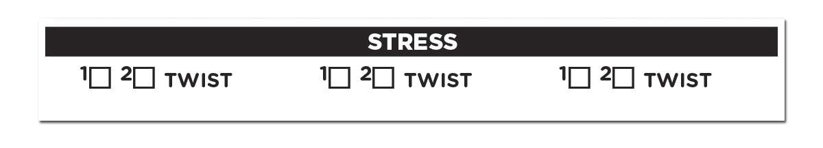When a conflict of any kind begins, set up three different stress tracks of two boxes each to pace the fight. Together, these three stress tracks are the conflict countdown. Each box is worth one stress: when the stress track is hit for 1-stress, mark one box. Each stress track leads to a twist.