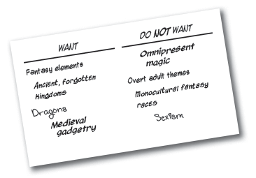 Once you have that list, look at it as a whole, and think about what game ideas could incorporate as many of those wants as possible. Some ideas are probably going to jump into your head immediately when you see the “want” list elements together. Voice them! Start the conversation! And don’t worry if you don’t get them all right off the bat—you can always use them as goalposts for later in the campaign.