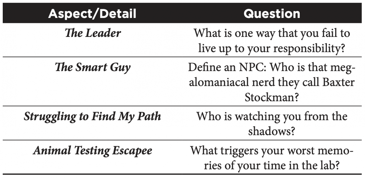 The distinction between character and setting aspects is that setting aspects are generally “zoomed out.” A good setting aspect suggests plenty of details or questions. However, most character aspects are already small enough to be their own detail. Instead of making a list of details and questions, let your character aspects be details themselves, and then attach a question to each. This gives you specificity, but still gives each player authorship over their character.