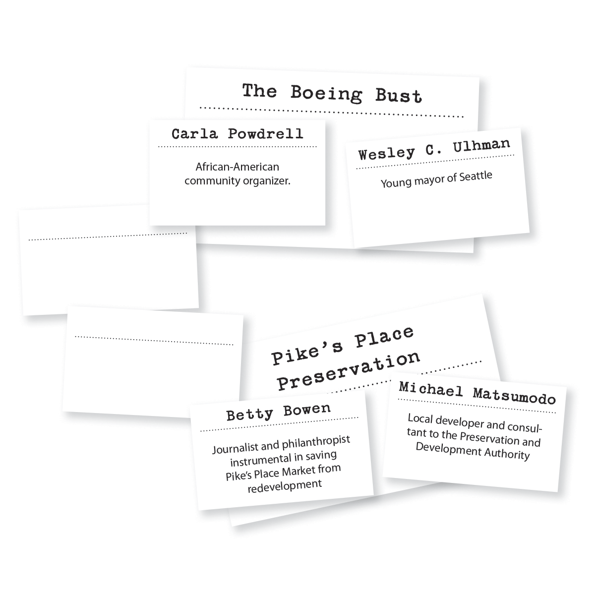 In order to give their relationships some structure, each character should tie into the impending issue selected at the start of the session (either The Boeing Bust or Pike’s Place Preservation) in addition to their other relationship aspects. These characters don’t have to be good friends—a labor organizer working at Boeing, a mechanic who is out of work because of layoffs, and a Boeing executive all tie into The Boeing Bust without necessarily being close companions before the start of the story.