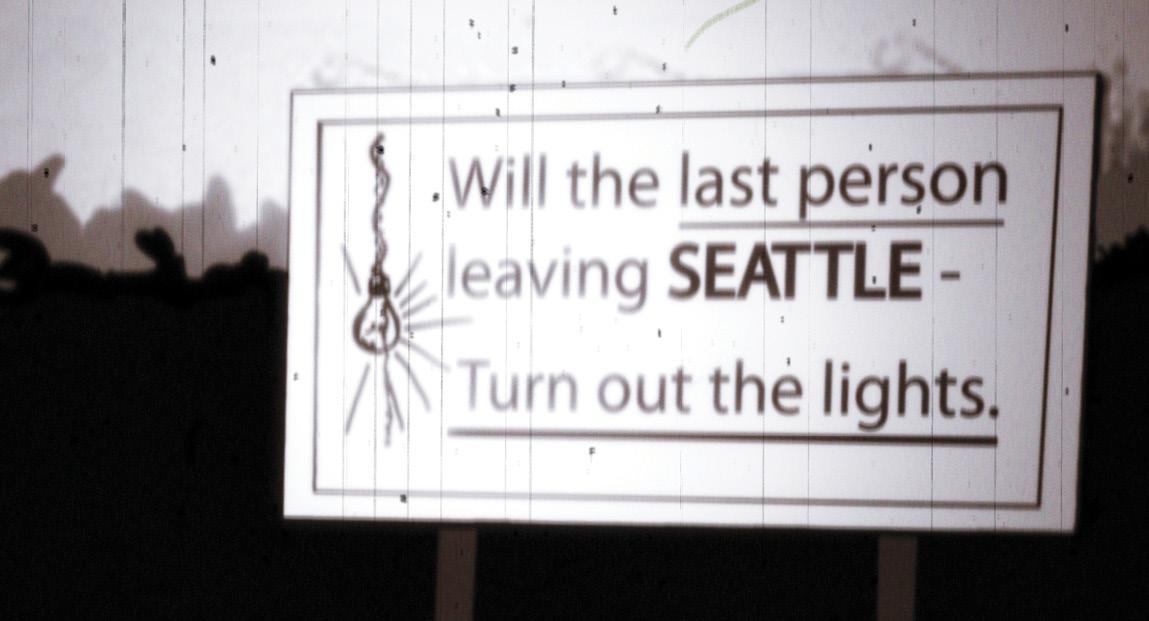 After World War II, Seattle underwent an economic transformation fueled by investments in education and infrastructure, a growing population, and the success of the largest local employer, Boeing. Yet as the space program ground to a halt in the late ‘60s and fuel prices spiked, Boeing’s fortunes took a turn for the worse: the airline giant laid off 70% of their Seattle workforce, an economic catastrophe that echoed throughout the city. In 1972, unemployment in Seattle has reached double digits (12%) and local political leaders see few options for turning things around quickly. Many young people in Seattle are contemplating leaving for greener pastures, and a new billboard has gone up near the airport: