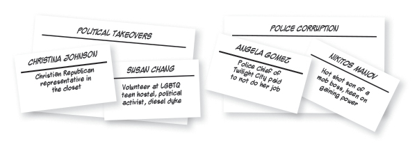 Then ask your players to choose from one of the two available impending issues: Political Takeovers or Police Corruption. Have them fill in one or two additional faces for their chosen impending issue as well, rounding out the larger cast of characters with their suggestions.
