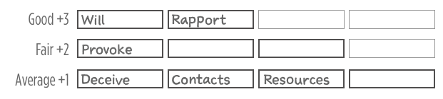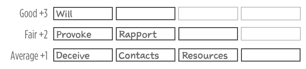 Meanwhile, Landon also gets a minor milestone. Lenny looks over his sheet, and notices that he spends a lot more time lying to people than he does trying to make friends with them. He asks Amanda if he can swap the ranks of his Deceive and his Rapport skill, giving him Good (+3) Deceive and Fair (+2) Rapport. She agrees, and he notes the new skill totals on his character sheet.